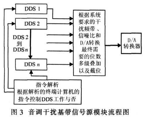以0.02 MHz為步進產(chǎn)生梳狀譜為例,根據(jù)系統(tǒng)選擇的基帶頻譜的范圍、信噪比依次產(chǎn)生450個以上的DDS,該DDS的時鐘頻率大于等于500 MHz,且受指令控制。當FPGA根據(jù)終端計算機發(fā)送的指令解析為某段頻率為本方通信頻率時,關(guān)斷該段頻率對應(yīng)的所有DDS。最后FPGA將所有DDS產(chǎn)生的頻點疊加輸出到D/A轉(zhuǎn)換器,經(jīng)過D/A轉(zhuǎn)換器送入前端混頻器。該方案的優(yōu)點是:干擾各個通信頻點,而不是整個頻帶,即使有較嚴重的交調(diào),但是其在該干擾點上的輸出功率較整頻帶干擾方式還是大得多,并且功放較為容易計算所需功率。這種方式在終端計算機中需根據(jù)指令實時運算相應(yīng)干擾參數(shù),幾乎可以選擇任意可干擾和可開窗頻段,且信噪比可達很高,不受控制激勵模塊硬件資源的限制嘲。圖3為音調(diào)干擾基帶信號源模塊的流程圖。