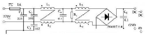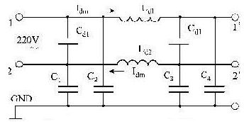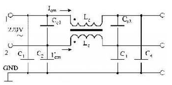 采用無源的EMI濾波器是抑制傳導(dǎo)干擾最有效的辦法。即在電路中插入一個帶通濾波器,讓50 Hz交流電暢通,其余頻率的信號受阻。但要嚴格控制濾波器LC元件的寄生參數(shù),它們的制作工藝、安裝位置、走線方式,都會影響EMI濾波效果。加接圖1所示的濾波電路,可以控制通過傳導(dǎo)耦合進入電網(wǎng)的噪聲電平。
