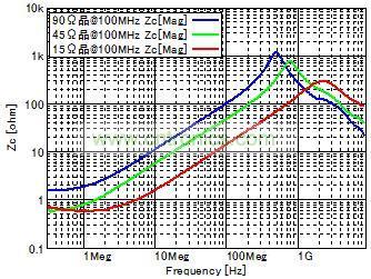 使用共模扼流線圈時的靜噪效果及信號波形評測圖5顯示的MHL信號線使用各種共模扼流線圈時的輻射噪聲/信號波形評測結(jié)果。共模扼流線圈在產(chǎn)生噪聲的30MHz~1GHz頻率段內(nèi),按照阻抗由高到低的順序,分別使用以下3種類型(90Ω、45Ω、15Ω@100MHz) (靜態(tài)特性請參考圖6) 來進行測量。