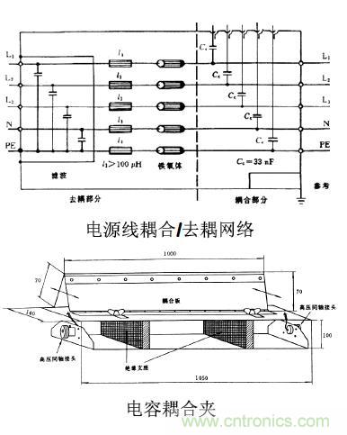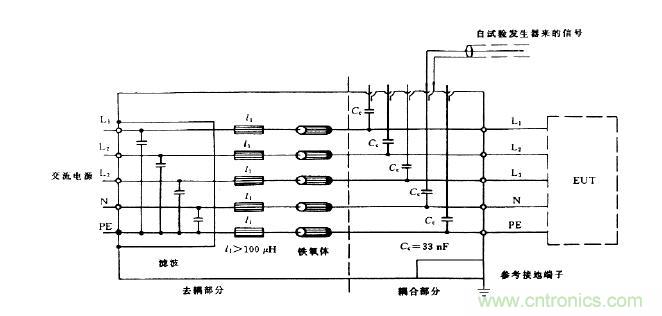 作為佐證,我們利用電源線耦合/去耦網(wǎng)絡(luò)來加以說明:在圖中可以看到從試驗發(fā)生器來的信號電纜芯線通過可供選擇的耦合電容加到相應(yīng)的電源線(L1、L2、L3、N及PE)上,信號電纜的屏蔽層則和耦合/去耦網(wǎng)絡(luò)的機殼相連,機殼則接到參考接地端子上。這就表明脈沖群干擾實際上是加在電源線與參考地之間,因此加在電源線上的干擾是共模干擾。