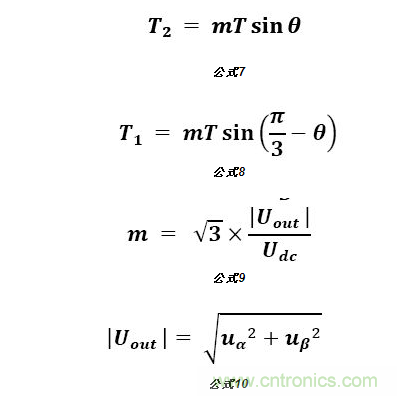 由此可知SVPWM實(shí)現(xiàn)步驟:先通過Uout判斷出電壓矢量所在扇區(qū),再根據(jù)相鄰的電壓矢量及Uout計(jì)算出兩個(gè)基本矢量作用時(shí)間;最后根據(jù)兩個(gè)基本矢量作用時(shí)間計(jì)算出PWM開關(guān)時(shí)間及占空比。