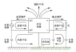 開關(guān)電源的電磁噪聲從噪聲源來說可以分為兩大類。一類是外部噪聲,例如,通過電網(wǎng)傳輸過來的共模和差模噪聲、外部電磁輻射對開關(guān)電源控制電路的干擾等。另一類是開關(guān)電源自身產(chǎn)生的電磁噪聲,如開關(guān)管和整流管的電流尖峰產(chǎn)生的諧波及電磁輻射干擾。