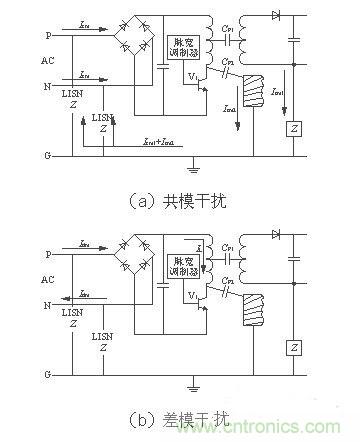 電源線噪聲是電網(wǎng)中各種用電設(shè)備產(chǎn)生的電磁騷擾沿著電源線傳播所造成的。電源線噪聲分為兩大類:共模干擾、差模干擾。共模干擾(Common-mode Interference)定義為任何載流導(dǎo)體與參考地之間的不希望有的電位差;差模干擾(Differential-mode Interference)定義為任何兩個載流導(dǎo)體之間的不希望有的電位差。兩種干擾的等效電路如圖2[1]所示。圖中CP1為變壓器初、次級之間的分布電容,CP2為開關(guān)電源與散熱器之間的分布電容(即開關(guān)管集電極與地之間的分布電容)。