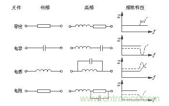 如圖4所示,在高頻工作下的元件都有高頻寄生特性[2],對其工作狀態(tài)產(chǎn)生影響。高頻工作時導(dǎo)線變成了發(fā)射線、電容變成了電感、電感變成了電容、電阻變成了共振電路。觀察圖4中的頻率特性曲線可以發(fā)現(xiàn),當(dāng)頻率過高時各元件的頻率特性產(chǎn)生了相當(dāng)大的變化。為了保證開關(guān)電源在高頻工作時的穩(wěn)定性,設(shè)計開關(guān)電源時要充分考慮元件在高頻工作時的特性,選擇使用高頻特性比較好的元件。另外,在高頻時,導(dǎo)線寄生電感的感抗顯著增加,由于電感的不可控性,最終使其變成一根發(fā)射線。也就成為了開關(guān)電源中的輻射干擾源。