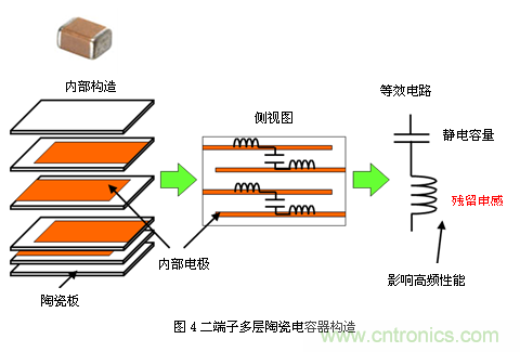 目前所使用的電容器多為片狀多層陶瓷電容器。圖4為二端子片狀多層電容器的結(jié)構(gòu)概念 圖。其結(jié)構(gòu)表現(xiàn)為,夾著電介質(zhì)薄片,分別與兩側(cè)外部電極連接的內(nèi)部電極交錯層疊。由于其為片狀結(jié)構(gòu),且無引線,因此該部分沒有殘留電感。然而,由于其內(nèi)部 還存在微量電感,因此在較高頻率下將導(dǎo)致性能下降。