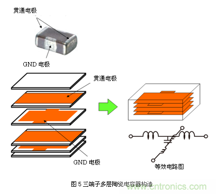 如圖5所示,片狀三端子電容器雖名為三端,但實(shí)為四端結(jié)構(gòu)。這是因?yàn)?,雖然四端設(shè)計(jì)可減少接地端電感,但電氣特性方面,無論哪個端子都具備相同電位。而引線型三端子電容器原本就為三端結(jié)構(gòu),因此貼片化后仍被稱為"三端"。[page]