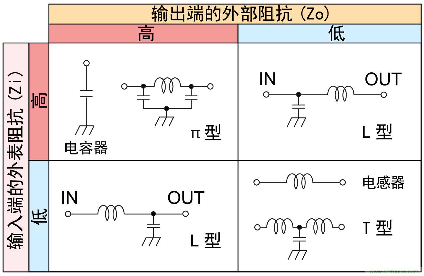 另 一方面,電感器具有所謂的用高阻抗使高頻噪聲反彈的作用,因此電感器與高阻抗部分相接則效果差,反之與低阻抗的電路相接則效果好?此原理歸納于圖2中?圖 中顯示了輸入端阻抗和輸出端阻抗的高低和該條件下噪聲除去效果好的濾波器結(jié)構(gòu)?從圖中可以看出,對于L型濾波器這類不具有對稱結(jié)構(gòu)的濾波器,若輸入輸出端 接反,則效果發(fā)生變化?使用時應(yīng)加以注意?