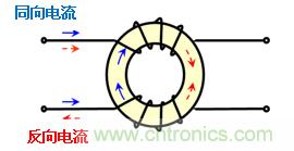共模扼流圈。共模扼流圈的基本構(gòu)造如圖1所示:一個(gè)磁芯里面有兩根繞線(xiàn)。這兩個(gè)繞線(xiàn)對(duì)應(yīng)的逆向電流流過(guò)時(shí)磁芯里產(chǎn)生的磁通會(huì)相互反向抵消,而同向的電流流過(guò)時(shí)磁通會(huì)相互向同方向產(chǎn)生,因此阻抗較高。通過(guò)這種方式共模扼流圈可以通過(guò)相互反向的差分信號(hào)但是卻可以抑制同向傳輸?shù)墓材T肼暋?/div>