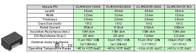 關(guān)于CAN中的噪聲對(duì)策產(chǎn)品,村田公司已經(jīng)將對(duì)應(yīng)的共模扼流圈DLW43SH系列產(chǎn)品化。該系列產(chǎn)品的外觀(guān)以及主要特征如圖2所示。DLW43SH系列是使用在CAN和FlexRay等車(chē)載LAN中的噪聲對(duì)策用共模扼流圈,是尺寸為4.5×3.2×2.6mm的表面貼裝品。特性值最大為100μH的共模電感,此外,DLW43SH的截止頻率約為1000MHz,可對(duì)應(yīng)高速差分信號(hào)對(duì)高頻的要求。使用溫度范圍在-40~+125℃,因此適用于車(chē)載的廣泛應(yīng)用。