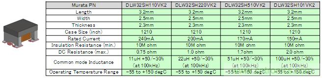 作為DLW43SH系列的小型化產(chǎn)品,DLW32SH系列目前正在開(kāi)發(fā)中。該系列的外觀(guān)以及主要特性如圖3所示。DLW32SH系列的尺寸為3.2×2.5×2.3mm具有小尺寸特點(diǎn),并且與DLW43SH系列相比,可實(shí)現(xiàn)同等性能。其構(gòu)造的特征是在產(chǎn)品端子部分使用了金屬支架,可以緩和由于溫度變化產(chǎn)生的熱伸縮影響,適用的溫度范圍達(dá)到了-55~+150℃。