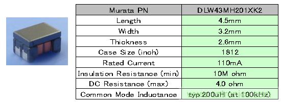 此外,村田公司目前正在開(kāi)發(fā)作為車(chē)載Ethernet用共模扼流圈的DLW43MH系列。該產(chǎn)品的外觀(guān)以及主要特性如圖4所示。DLW43MH系列的尺寸和DLW43SH系列同為4.5×3.2×2.6mm,共模電感值提高到了200μH,因此在較寬的頻帶中能起到有效的噪聲對(duì)策效果。由于在繞線(xiàn)上下足了功夫并且改善了共模轉(zhuǎn)差模噪聲,因此噪聲改善效果會(huì)更加好。