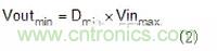 試圖在2MHz條件下工作時(shí)的第二個(gè)考慮因素是最小輸入電壓(VIN)和輸出電壓(VOUT)的轉(zhuǎn)換比。這與轉(zhuǎn)換器的最小接通時(shí)間有關(guān),因?yàn)樵摫嚷试谵D(zhuǎn)換器需要操作時(shí)設(shè)定接通時(shí)間。例如,若轉(zhuǎn)換器具有100ns的最小導(dǎo)通時(shí)間且在2MHz條件下工作,則使用公式1,其可以支持的最小轉(zhuǎn)換比(Dmin)為20%。若給定的VIN至VOUT比所需的導(dǎo)通時(shí)間小于最小導(dǎo)通時(shí)間,則多數(shù)轉(zhuǎn)換器進(jìn)入脈沖跨越模式以保持輸出電壓穩(wěn)定。當(dāng)脈沖跨越時(shí),開(kāi)關(guān)頻率發(fā)生變化且可能在需要限制噪聲的頻率中引起噪聲。