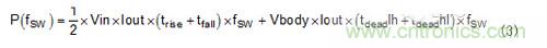 與開(kāi)關(guān)頻率相關(guān)的轉(zhuǎn)換器中的兩個(gè)主要損耗是高側(cè)MOSFET和死區(qū)時(shí)間損耗的開(kāi)關(guān)損耗。等式3是這些損失的基本估計(jì),您可用它進(jìn)一步分析伴隨較高開(kāi)關(guān)頻率損耗增加的影響。例如,若為5V輸入、4A負(fù)載、3ns上升時(shí)間、2ns下降時(shí)間、0.7V體二極管壓降和20ns死區(qū)時(shí)間,預(yù)估功率損耗在2MHz時(shí)為325mW,在400kHz時(shí)為65mW。
