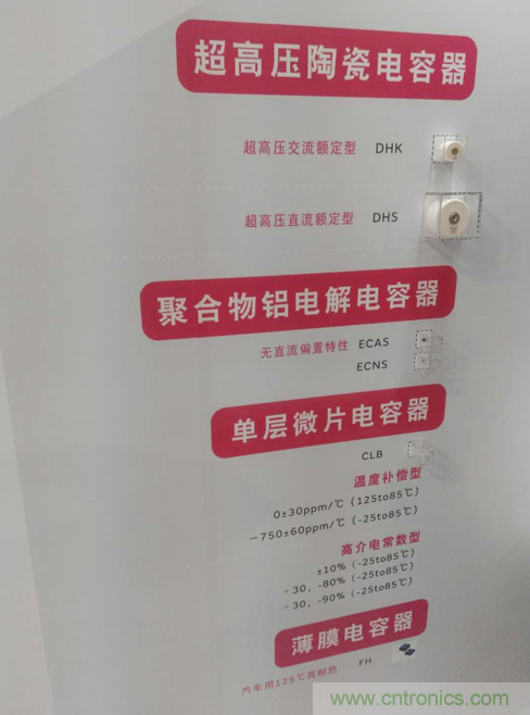 也許是由于近年來MLCC等電容器需求再次暴漲,村田在今年的展位上開始重新強調電容器這一傳統(tǒng)優(yōu)勢產品,并在現(xiàn)場展示了包括MLCC、超高壓陶瓷電容器、聚合物鋁電解電容器、單層微片電容器、薄膜電容器等極其豐富的電容產品線。