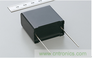 在產品展示區(qū),村田展示了一款可在125℃的高溫環(huán)境下連續(xù)使用的、支持自我修復功能的車載用高耐熱薄膜電容器。該產品是村田與指月電機制作所共同研發(fā),將類屬于熱硬化樹脂的薄膜作為介電質,可以耐高溫,非常適合未來要求更高溫保證的環(huán)保車的轉換器和電機驅動用變換器等產品,樣品從2017年9月份開始提供,并將于2018年4月開始量產。