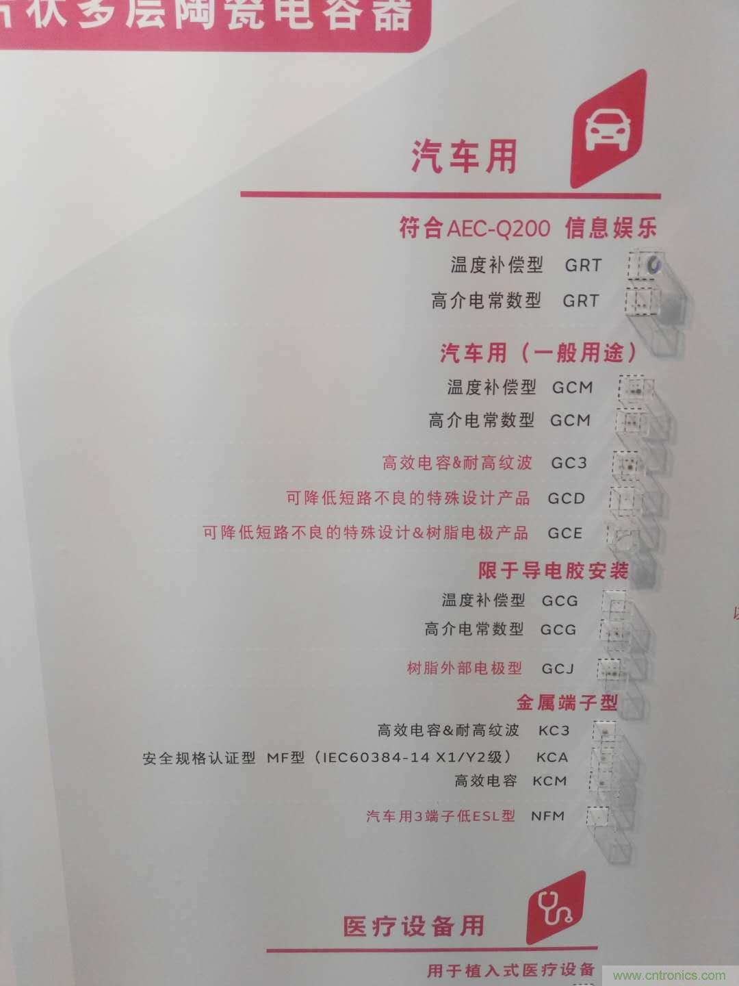 村田車載MLCC產品線可細分為符合AEC-Q200的信息娛用樂電容器、限于導電安裝電容器、金屬端子型電容器、汽車一般用途電容器,此外還有專門用在傳動/安全(AEC-Q200)的電容以及最大溫度150℃的溫度補償型和高介質常數(shù)型電容器。