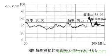 本開關(guān)電源一次通過了傳導騷擾的測試,測試波形如圖2、3所示。輻射騷擾高頻段230~1000MHz也測試合格,如圖5所示。只是在30~200MHz頻段范圍內(nèi)的垂直極化指標超標,最大超標20dB,如圖4所示。