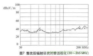 由測試結(jié)果可以看出,通過電磁兼容設計在傳導騷擾抑制方面取得了良好效果,在高頻段輻射騷擾的設計也達到了預期效果,下面還需對在30~200MHz頻段范圍內(nèi)的輻射騷擾進行改進設計。