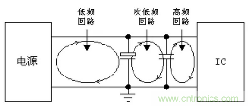 電路板入口處的電源去耦:大多數電路板的電源入口處去耦包括一個大的去耦電解電容并一到兩個小的高頻去耦電容,主要作用是為數字電路提供再充電,同時減少高頻噪聲。