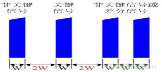 4、時鐘線、總線、射頻線等關鍵信號走線和其他同層平行走線應滿足3W原則。