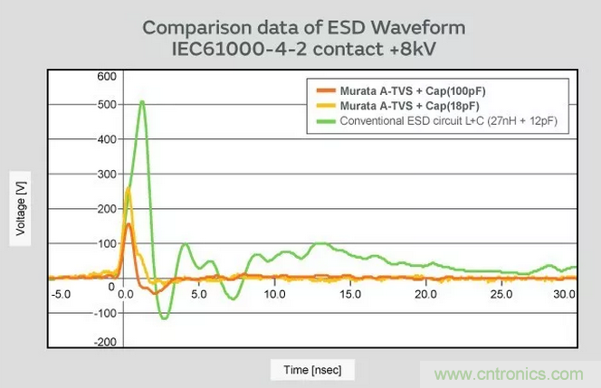 A-TVS和電容器組合,比較電感器和電容器組合的ESD保護(hù)性能。A-TVS和電容器的組合可更有效地抑制ESD。