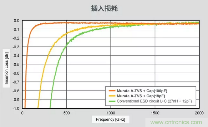 村田的陶瓷ESD保護(hù)裝置將A-TVS(LXES**A系列)和電容器組合起來,提高ESD耐性并抑制低頻帶的插入損耗。