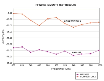 而器件X的噪聲抑制平均讀數(shù)僅有-18dBV,這意味著在RF影響下輸出變化為125mVRMS (相對于1V)。這個增加值很大,是正常值50µVRMS的2500倍。因此,器件X的RF抗干擾能力很差(-18dBV),當(dāng)靠近蜂窩電話或其它RF源時可能無法正常工作。顯然,對于音頻處理應(yīng)用如耳機(jī)放大器和話筒放大器,MAX4232是一個更好的選擇。