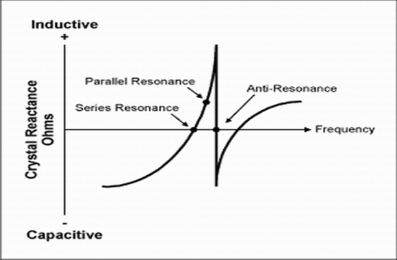 通過添加外部元件(通常是電容),石英晶體可振蕩在串聯(lián)與反諧振頻率之間的任何頻率上。在晶體工業(yè)中,這就是并聯(lián)頻率或者并聯(lián)模式。這個頻率高于串聯(lián)諧振頻率低于晶體真正的并聯(lián)諧振頻率(反諧振點(diǎn))。圖2給出了典型的晶體阻抗與頻率關(guān)系的特性圖。