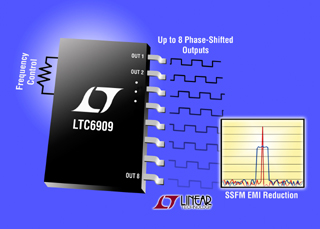 凌力爾特公司 (Linear Technology Corporation) 推出精確硅振蕩器LTC6909,該器件極大地降低了峰值輻射 EMI,并在多相電源中改善了開關(guān)穩(wěn)壓器的控制。LTC6909 有 8 個獨立輸出,提供多達(dá) 8 個軌至軌 50% 占空比時鐘信號。這些輸出可以用來啟動或禁止以及實現(xiàn)多個開關(guān)穩(wěn)壓器的相位同步。相位同步提供多種設(shè)計優(yōu)勢,包括改善的 EMI 性能、降低的輸入和輸出紋波電流、以及更好的負(fù)載瞬態(tài)響應(yīng)。使用 3 個邏輯輸入,這些輸出之間的相位關(guān)系可以從 45o 至 120o 配置,或者輸出可以被置于邏輯低或高 Z 狀態(tài)。