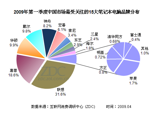 根據(jù)用戶的關(guān)注度狀況,ZDC統(tǒng)計(jì)出第一季度中國市場(chǎng)關(guān)注度最高的前十五大筆記本品牌。
