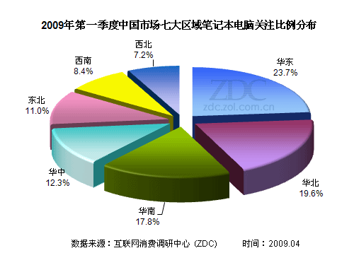 (圖) 2009年第一季度中國市場(chǎng)七大區(qū)域筆記本電腦關(guān)注比例分布
