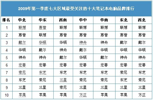 ZDC調(diào)查結(jié)果顯示,在全國七大區(qū)域筆記本電腦市場(chǎng)上,聯(lián)想與惠普的冠軍爭(zhēng)奪戰(zhàn)較為突出,最終聯(lián)想勝出,除華東地區(qū)的冠軍之位被惠普奪得之外,其他地區(qū)聯(lián)想均穩(wěn)居冠軍的寶座。