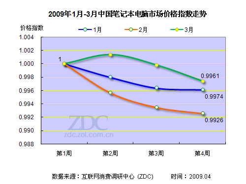 根據(jù)ZDC的價(jià)格監(jiān)測(cè)數(shù)據(jù)顯示,2009年第一季度筆記本市場(chǎng)的價(jià)格降幅較小,三個(gè)月的價(jià)格指數(shù)均下降了不到1個(gè)百分點(diǎn)。1月份173款筆記本降價(jià)竟是“蜻蜓點(diǎn)水”,最終價(jià)格指數(shù)僅下降了0.39個(gè)百分點(diǎn)。這主要是由于隨著春節(jié)的臨近,多款產(chǎn)品出現(xiàn)缺貨現(xiàn)象:一方面是一些熱門產(chǎn)品本身暢銷、供不應(yīng)求;另一方面是部分經(jīng)銷商囤積居奇,希望狠賺一筆。