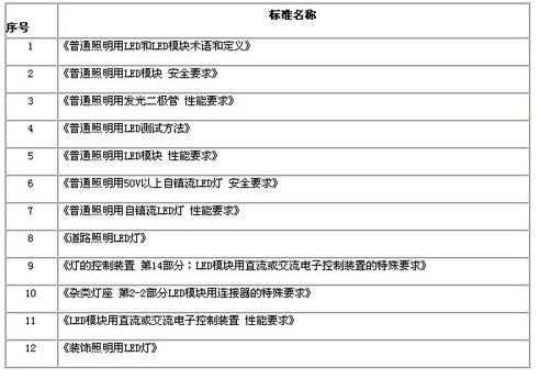 標(biāo)準(zhǔn)的目的在于加強(qiáng)生產(chǎn)的一致性、提升質(zhì)量、并增進(jìn)生產(chǎn)效率,若欲提升LED的制造質(zhì)量,在全球化的競爭脫穎而出,標(biāo)準(zhǔn)是一項(xiàng)不可或缺的工具,因此加速對LED標(biāo)準(zhǔn)的制定是各國政府及業(yè)界非常重視的問題。2007年在半導(dǎo)體照明標(biāo)準(zhǔn)工作指導(dǎo)委員會(huì)的指導(dǎo)下,由“國家半導(dǎo)體照明工程研發(fā)及產(chǎn)業(yè)聯(lián)盟”成立“聯(lián)盟標(biāo)準(zhǔn)化協(xié)調(diào)推進(jìn)工作組”,以負(fù)責(zé)協(xié)調(diào)中國的LED標(biāo)準(zhǔn)進(jìn)度。而目前最新進(jìn)展是由“全國照明電器標(biāo)準(zhǔn)化技術(shù)委員會(huì)”提出的普通照明用LED國家標(biāo)準(zhǔn)及行業(yè)標(biāo)準(zhǔn)等10多項(xiàng)標(biāo)準(zhǔn)目前都在送審階段,預(yù)計(jì)于今年陸續(xù)頒布實(shí)施,如表所示。