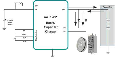 為更好地實現(xiàn)這一目標, AAT1282具有防止啟動時過大尖峰電流沖擊的內(nèi)置電路、一個固定的800mA輸入電流限制器、以及一個超級電容充滿電后的負載斷開電路。其輸出電壓受限于內(nèi)部過壓保護電路,可防止轉(zhuǎn)換器和超級電容免受一個開路LED(開路條件下)的損害。