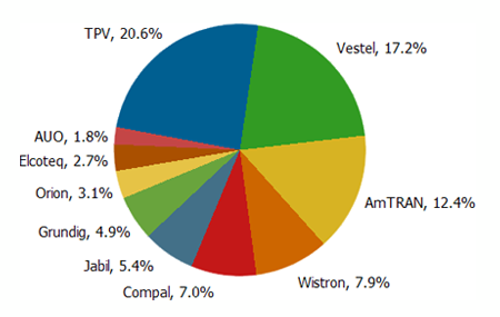 從代工廠商排名來看,TPV主要客戶有Vizio、AOC以及Philips,第一季市占率為20.6%排名居首;Vestel以17.2%市占率居次,而其主要生產(chǎn)供貨給自有品牌、白牌業(yè)者以及賣場品牌機種;第三名代工廠商為AmTRAN,第一季市占率12.4%,該公司主要客戶為Vizio。同時隨著中國液晶電視出貨對全球液晶電視市場日益重要,以及國內(nèi)品牌廠商市占率超過海外品牌廠商,DisplaySearch在每季度報告中均包括有中國電視廠商供應鏈的詳細分析,對關(guān)心中國市場的客戶是一份相當值得參考的資料。
