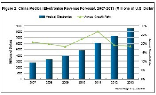 2009 年中國醫(yī)療電子設(shè)備銷售額將增長18.2%,從2008 年的33 億美元增長到39 億美元。未來幾年將保持這種強勁勢頭,復(fù)合年增長率將達21%,到2013 年上升到86 億美元。