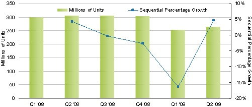 據(jù)iSuppli公司,第二季度全球手機(jī)出貨量比第一季度增長(zhǎng)4.7%,這是自2008年第三季度以來首次出現(xiàn)環(huán)比增長(zhǎng)。第二季度全球手機(jī)出貨量為2.65億部,而第一季度是2.53億部。