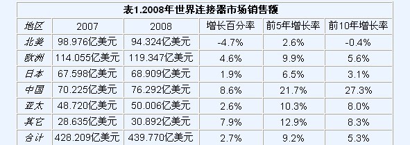 專業(yè)的連接器市場研究公司-Bishop&Associates于2009年4月公布了2008年世界連接器工業(yè)市場數(shù)據(jù),數(shù)據(jù)顯示受世界經(jīng)濟(jì)危機(jī)的拖累,2008年世界連接器工業(yè)銷售增幅急劇下滑,與上一年相比,僅增長2.7%,而2007年的增幅為7.2%,盡管如此,連接器工業(yè)仍然實現(xiàn)了6年的連續(xù)增長(2003 年11.2%, 2004年17.9%,2005年6.2%,2006年12.6%,2007年7.2%,2008年2.7%),與經(jīng)濟(jì)危機(jī)下其它電子元器件普遍負(fù)增長的糟糕表現(xiàn)相比,這一增長數(shù)字,是令人欣慰的。