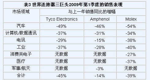2009年第一季度已經(jīng)過去,連接器產(chǎn)品訂單劇降41.7%,銷售則下挫了35.7%,這兩項數(shù)據(jù)結(jié)果均創(chuàng)下了連接器工業(yè)的歷史新低。在上一次表現(xiàn)最糟糕的2002年第四季度,銷售和定單下降了31.2%。所有最終應(yīng)用市場均報告直線下降,一片蕭條跡象。三家世界最大的連接器公司泰科電子(Tyco Electronics)、安費(fèi)諾(Amphenol)和莫列克斯(Molex)也均報告與上一年同比銷售嚴(yán)重下降,如下表3所示。