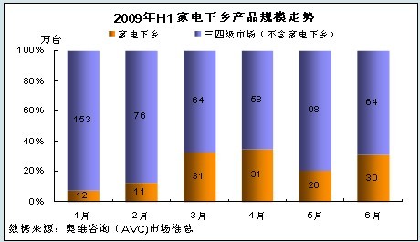 根據(jù)奧維咨詢(xún)(AVC)對(duì)家電下鄉(xiāng)市場(chǎng)的監(jiān)測(cè)以及對(duì)全國(guó)市場(chǎng)零售規(guī)模的評(píng)估,2009年1-6月份彩電下鄉(xiāng)零售規(guī)模為141.09萬(wàn)臺(tái),占三四級(jí)市場(chǎng)的總量的21.54%。
