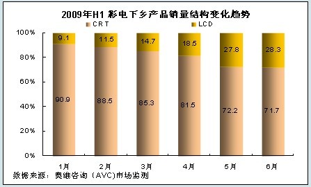 隨著LCD電視產(chǎn)品價(jià)格的不斷下降,在城市市場(chǎng)LCD電視對(duì)CRT電視的替代率在不斷增加,目前CRT電視在城市市場(chǎng)已經(jīng)處于一個(gè)補(bǔ)充的從屬地位,農(nóng)村市場(chǎng)已經(jīng)成為CRT產(chǎn)品銷(xiāo)售的主要市場(chǎng)。從彩電下鄉(xiāng)的銷(xiāo)售數(shù)據(jù)來(lái)看,2009年上半年CRT銷(xiāo)售占家電下鄉(xiāng)銷(xiāo)售總量的79.94%,仍占據(jù)彩電下鄉(xiāng)的主導(dǎo)地位;從銷(xiāo)售比重的走勢(shì)看,LCD正不斷侵蝕CRT的市場(chǎng),其中尤以4、5月份侵蝕速度最快。