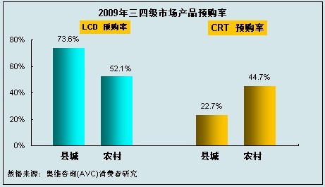 奧維咨詢(xún)(AVC)對(duì)主要下鄉(xiāng)省份的三四級(jí)市場(chǎng)研究結(jié)果顯示,在有計(jì)劃于2009年購(gòu)買(mǎi)彩電產(chǎn)品的人群中,他們更傾向于購(gòu)買(mǎi)LCD產(chǎn)品,;而即使在農(nóng)村市場(chǎng),CRT產(chǎn)品的預(yù)購(gòu)率仍要低于LCD產(chǎn)品,扣除消費(fèi)者購(gòu)買(mǎi)能力因素,LCD在農(nóng)村市場(chǎng)的被接受程度仍然較高。