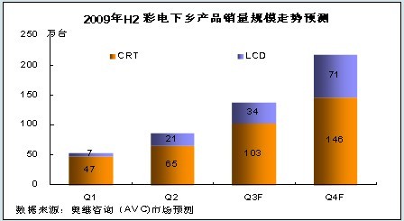 根據(jù)奧維咨詢(xún)(AVC)對(duì)三四級(jí)以及農(nóng)村市場(chǎng)的理解和研究,結(jié)合下半年彩電業(yè)形勢(shì),我們認(rèn)為:隨著各省對(duì)家電下鄉(xiāng)工作的進(jìn)一步開(kāi)展以及彩電市場(chǎng)傳統(tǒng)旺季的到來(lái),2009年第三、四季度,彩電下鄉(xiāng)規(guī)模將繼續(xù)保持較快速度增長(zhǎng),同時(shí)LCD產(chǎn)品的比重也將進(jìn)一步增加,到第四季度,LCD產(chǎn)品銷(xiāo)量比重將占彩電下鄉(xiāng)市場(chǎng)的三分之一,銷(xiāo)售額比重將突破50%。