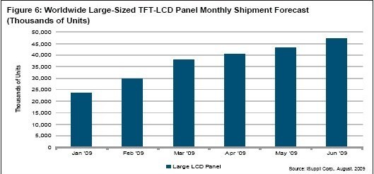 2009年整個第二季度,全球大尺寸LCD面板出貨量比第一季度上升了43%,比2008年第二季度上升了12%。這應(yīng)歸因于全球經(jīng)濟(jì)好轉(zhuǎn)、中國市場需求旺盛、新型號的推出、向16:9面板的轉(zhuǎn)變、以及越來越多地使用LED背光技術(shù)。