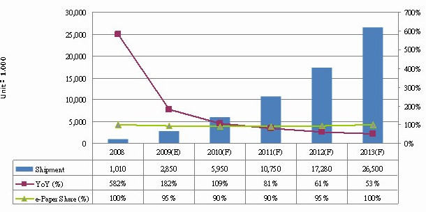 由于電子紙潛在市場(chǎng)可觀,加上全球電子書銷售量持續(xù)增長(zhǎng),更為電子紙的應(yīng)用注入強(qiáng)心劑。根據(jù)Andrew Tribute研究數(shù)據(jù)指出,全球電子書內(nèi)容銷售量每月約為40萬(wàn)本,預(yù)估2010年數(shù)字?jǐn)?shù)據(jù)的產(chǎn)量將與紙本數(shù)據(jù)平分秋色,2020年數(shù)字?jǐn)?shù)據(jù)的市場(chǎng)占有率更達(dá)65%,數(shù)字出版增長(zhǎng)動(dòng)能大增,各式電子閱讀器也紛紛出籠,勢(shì)不可擋。