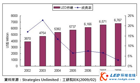 由于需求減緩,難以消耗年初所擴增產(chǎn)能,導(dǎo)致產(chǎn)品單價巨幅的向下變動,整體市場景氣由繁榮轉(zhuǎn)為衰退,所幸上半年市場成長,抵銷部分下半年市場衰退負(fù)面影響,2008年全球LED市場較2007年微幅成長3%,達(dá)67.6億美元,詳如圖一所示。