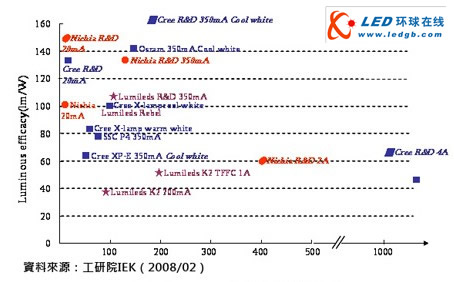 2001年標(biāo)準(zhǔn)型白光LED(20mA)發(fā)光效率僅25lm/W,至2009年初Nichia發(fā)表之白光LED,在20mA電流下,其發(fā)光效率可達(dá)249lm/W,為目前業(yè)界之最。高功率白光LED(350mA)發(fā)光效率也由2004年約30 lm/W,截至2008年年底Cree發(fā)表161lm/W產(chǎn)品為業(yè)界之最。