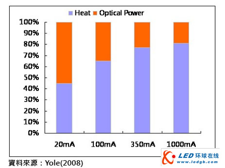 LED發(fā)光效率除了影響到光通量輸出,以及耗能外,「熱」另外一個重要關(guān)鍵,以目前普遍商品化LED發(fā)光效率分析(如圖五),1W高功率LED發(fā)光效率約在70lm/W左右,其中有77%能量以熱的型態(tài)表現(xiàn)出來,僅有23%能量以光的型態(tài)表現(xiàn)出來,當(dāng)輸入功率愈高,產(chǎn)生的熱愈多,因此需要更多的散熱組件,導(dǎo)致LED成本提高、可靠度降低,若能提高LED發(fā)光效率,LED散熱問題自然可以解決。