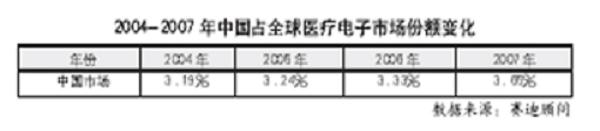 圖二:2004~2007年我國占全球醫(yī)療電子市場份額的變化
